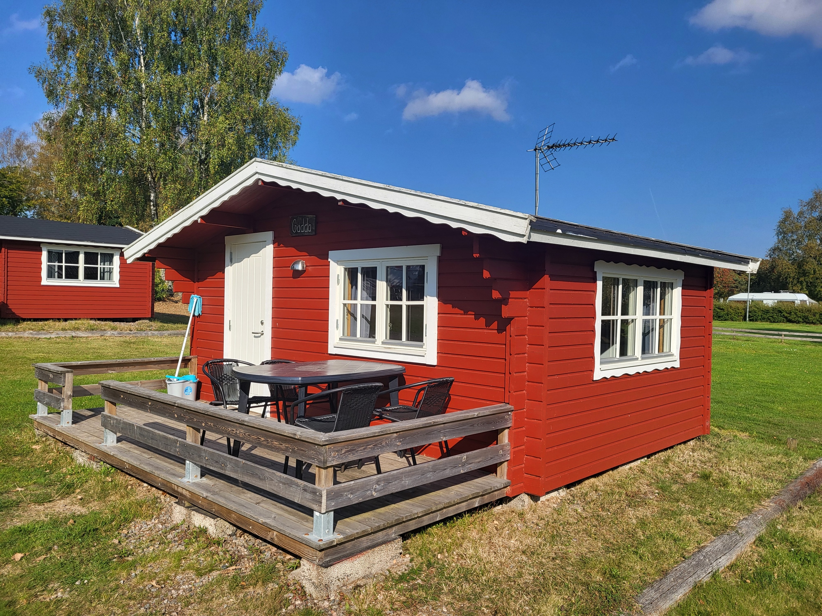 2 self-catering cottages.6 Beds in 2 bedrooms and a loft. In the attic there is a double bed. In one room there is a bunk bed and in the other two single beds. Shower and toilet and fully equipped kitchen.TV and internet.Located about 10 m from the water with patio down to the lake. Pets are allowed.